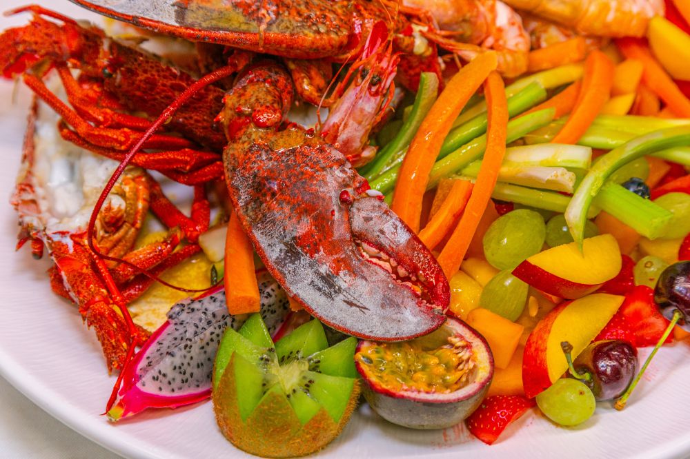 Aragosta e Astice, scampi, gamberi e gambero rosso, con frutta e verdura di stagione